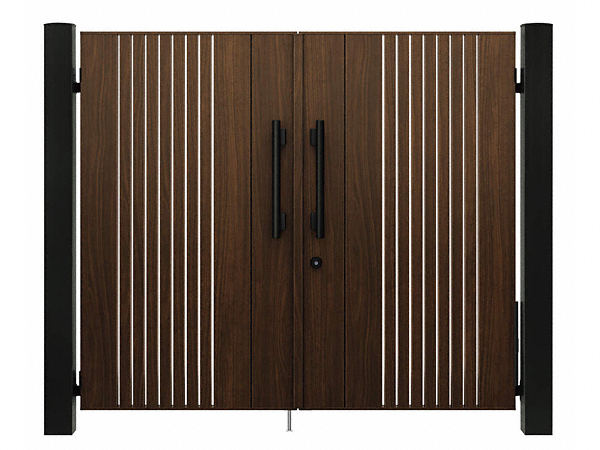 エクスティアラ 門扉 TB1型 たて格子 片開き 木調色は板張り×太格子の門扉です。ハンドルは抗菌抗ウイルス塗装がされており衛生的で、デザインも面材から戸当りまでカラー統一するこだわり。また、耐風性能(YKKAP社基準・施錠時)は風速42m/s相当があります。