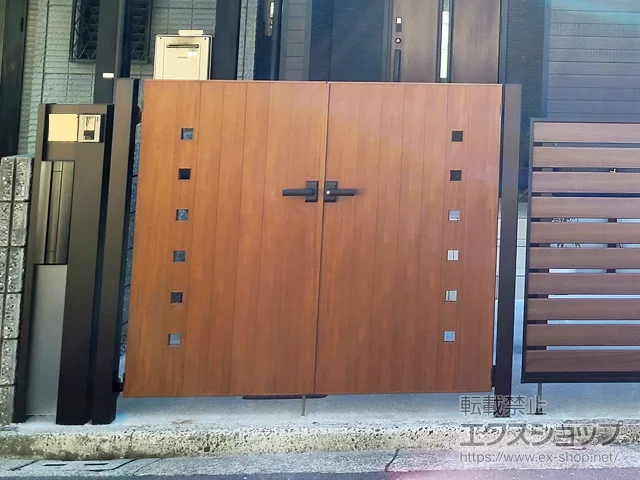 ルシアス 門扉 FK1型 小窓 両開き 木調色は落ち着いた気品を纏いながらモダンな美しさを有します。エクスショップでは「上質なデザインの門扉を導入し、住宅の外観を引き立てたい」という方にルシアス 門扉 FK1型 小窓 両開き 木調色をおすすめします。