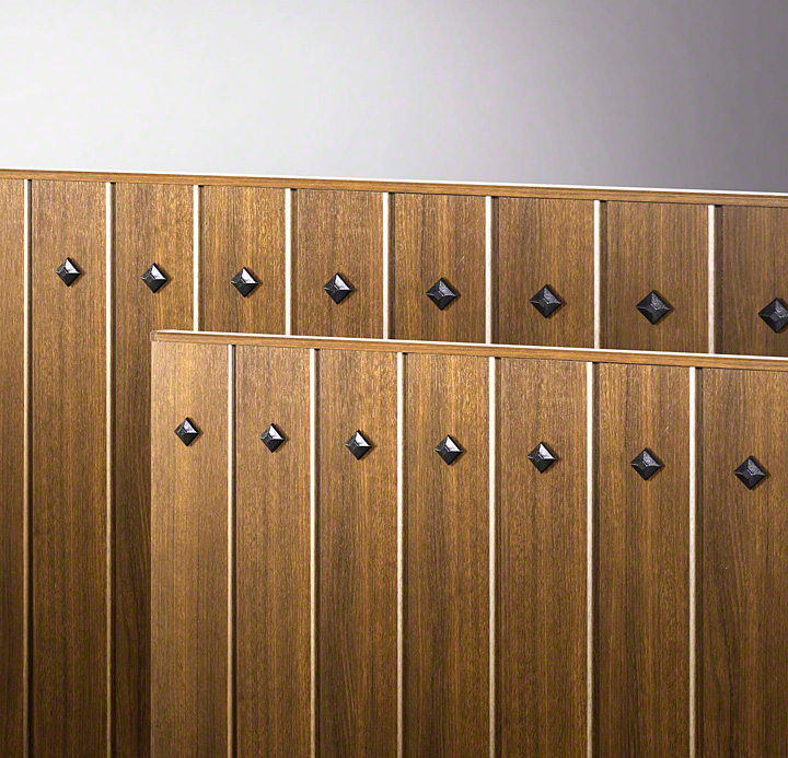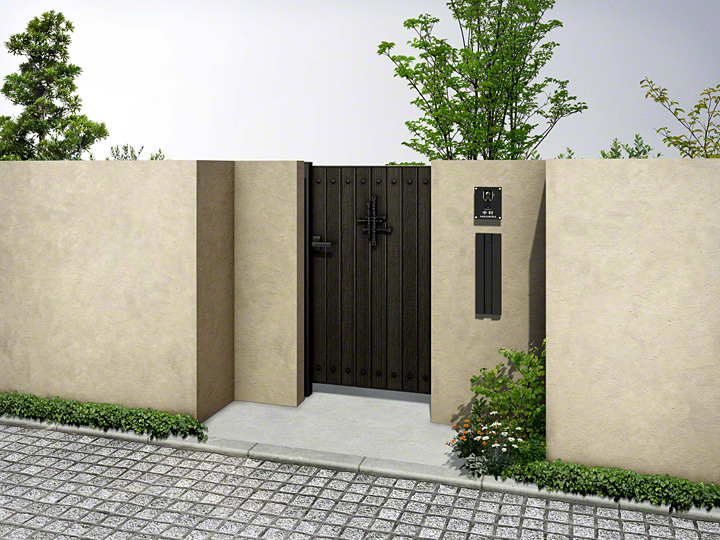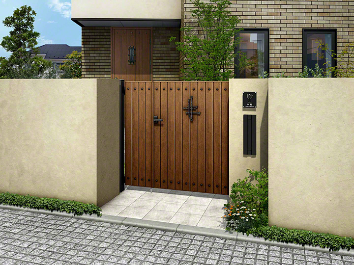 ルアシス門 BW04型は、たて板貼りの木調デザインで鋲がデザインされた門扉です。木調の素材感が引き立つ、シンプルな横張り洋風デザインです。門扉の大きさは、入り口幅に合わせて、片開き・両開き・親子開きの中からお選びください。ロートアイアン調のオーナメントなど、立体感や素材感、ディテール表現にこだわり、見た目も質感も美しい門扉です。