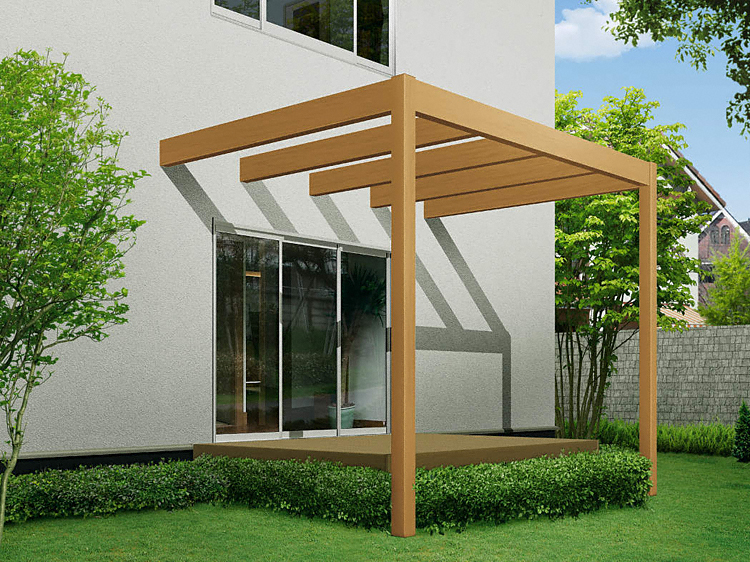 建物とエクステリア空間をトータルコーディネートする「リレーリア」シリーズのパーゴラです。デザイン性の高いパーゴラ空間をお好みに合わせて自由に創造できます。上品な木調色マテリアルカラーをご用意しました。