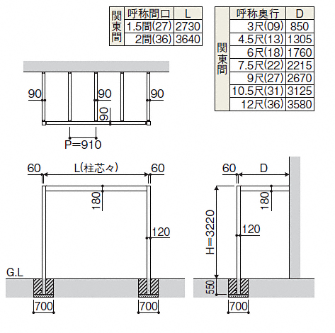 規格奥行 | 850mm / 1305mm / 1760mm / 2115mm / 2670mm / 3125mm / 3580mm |