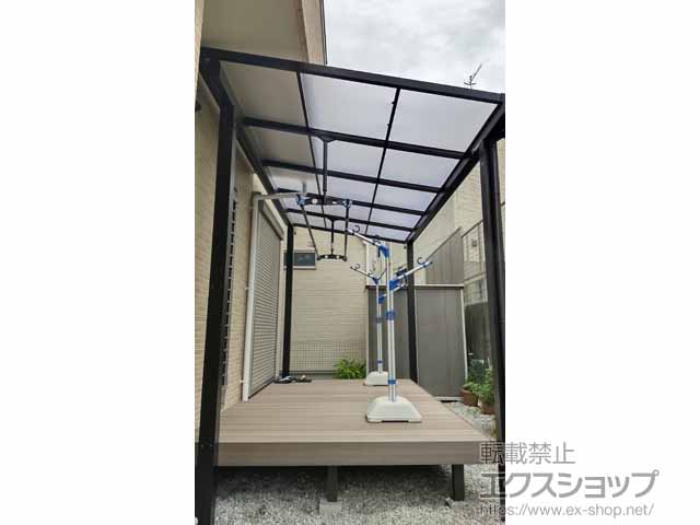 4本の柱でしっかりと屋根を支えるソラリア F型 独立タイプのテラス屋根が、周囲の景観に違和感なく調和し、ウッドデッキのテラス全体に屋根がついても、採光性を損なわず、明るいお仕上がりでございますね。雨天時にも気兼ねなくお洗濯物を干して頂け、熱線遮断ポリカーボネート(クリアマット調)の屋根には、夏場の太陽光線を和らげる事にも期待が出来ますので、テラス屋根を設置した事で、ウッドデッキのテラススペースが快適にお過ごし頂ける空間になりましたら幸いでございます。これからもお客様の快適な暮らしを作るお手伝いが出来るよう、スタッフ一同努力を重ねて参りますので、今後もエクスショップにご用命頂きますよう、宜しくお願い申し上げます。