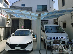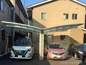 この度は、アリュース Y合掌の施工をエクスショップにお任せ下さり、誠にありがとうございます。2台の車を効率良く駐車でき、快適にお使い頂けるものと存じます。熱線遮断ポリカーボネートが、大切なお車を汚れや劣化から守りながら、雨天時の乗り降りの煩わしさや、夏の車内温度の不快感等も解消してくれますので、この先長くご愛用頂けますと幸いです。エクスショップでは、暮らしを豊かにするエクステリア商品を多数取り揃えておりますので、また機会がございましたら是非弊社にご用命下さいませ。心よりお待ち致しております。