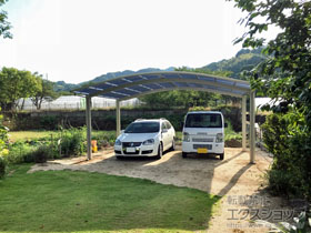 この度は弊社でアリュース 600タイプ 2台用の施工のご依頼を頂きまして、誠に有り難うございます。ハンドメイドの木のベンチやテーブルはとても味があり、素敵でございますね。シンプルなカーポートが周囲の田園風景やベンチ・テーブルに違和感なく収まりました事、嬉しく存じます。熱線遮断ポリカーボネート(アースブルーマット調)の屋根が紫外線や太陽光線を遮りますので、これまで以上に快適にBBQ等を楽しんで頂けるのではないでしょうか。機能性の高いカーポートを永くご愛用頂けますと幸いでございます。これからも業界最安値を目指し、企業努力を重ねて参りますので、今後もエクスショップにご用命頂きますよう、宜しくお願い申し上げます。