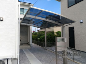 この度は弊社でプレシオスポート アール型 1台用の施工のご依頼を頂きまして、誠に有り難うございます。落ち着いたお色味でご自宅や周囲の景観に調和する、グレースブラウンのフレームのカーポートが、敷地内に自然に収まりました事。嬉しく存じます。屋根が出来た事により、車の汚れ軽減をご実感頂けているとの事で、安堵しております。ポリカーボネート(スカイブルー)の屋根は紫外線透過率ほぼ0%のため、色あせ等の軽減にも効果を期待できるのではないかと存じます。これからもお客様の快適な暮らしの為に、商品知識の向上に努めて参りますので、今後もエクスショップをご愛顧頂きますよう、宜しくお願い申し上げます。