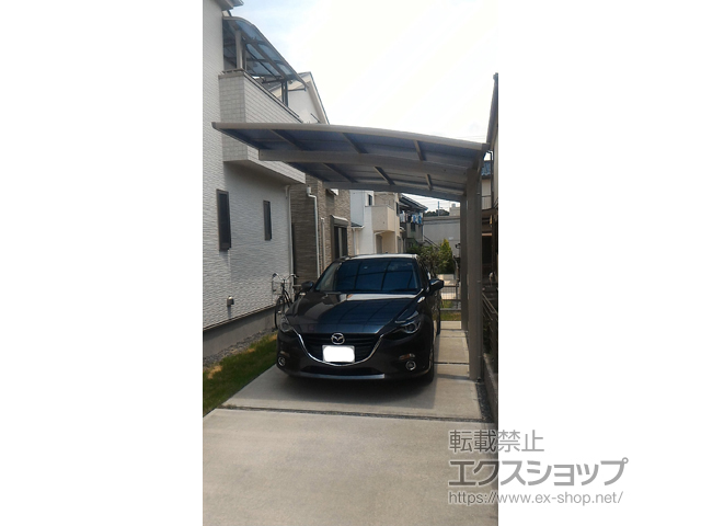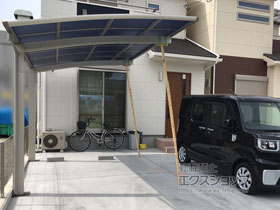 この度は弊社でプレシオスポート アール型 1台用の施工のご依頼を頂きまして、誠に有り難うございます。落ち着いたお色味でご自宅や周囲の景観に調和する、グレースブラウンのフレームのカーポートが、敷地内に自然に収まりました事。嬉しく存じます。屋根が出来た事により、車の汚れ軽減をご実感頂けているとの事で、安堵しております。ポリカーボネート(スカイブルー)の屋根は紫外線透過率ほぼ0%のため、色あせ等の軽減にも効果を期待できるのではないかと存じます。これからもお客様の快適な暮らしの為に、商品知識の向上に努めて参りますので、今後もエクスショップをご愛顧頂きますよう、宜しくお願い申し上げます。