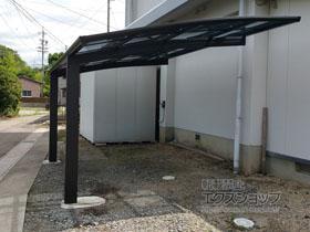 この度は弊社でプレシオスポート アール型 1台用の施工のご依頼を頂きまして、誠に有り難うございます。落ち着いたお色味でご自宅や周囲の景観に調和する、グレースブラウンのフレームのカーポートが、敷地内に自然に収まりました事。嬉しく存じます。屋根が出来た事により、車の汚れ軽減をご実感頂けているとの事で、安堵しております。ポリカーボネート(スカイブルー)の屋根は紫外線透過率ほぼ0%のため、色あせ等の軽減にも効果を期待できるのではないかと存じます。これからもお客様の快適な暮らしの為に、商品知識の向上に努めて参りますので、今後もエクスショップをご愛顧頂きますよう、宜しくお願い申し上げます。