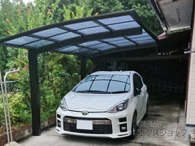 アリュース 600タイプ 縦連棟セット(4台用)とプレシオスポート アール型の施工をご依頼頂きまして、誠に有り難うございます。無駄のないすっきりしたデザインですので、屋根の下も広々とご使用頂けるものと存じます。熱線遮断ポリカーボネートの屋根材は、雨だけでなく、有害な紫外線や熱も遮断するため、1年を通して快適にご使用頂けるものと存じます。特に、お車4台分のスペースは広々として、様々な用途にご活用頂けますね。これからも、エクステリアの施工を通じて、豊かな暮らしのお手伝いをして参ります。また機会がございましたら、是非エクスショップにご用命頂きますよう宜しくお願い致します。