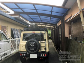 この度は弊社でプレシオスポート アール型 1台用の施工のご依頼を頂きまして、誠に有り難うございます。落ち着いたお色味でご自宅や周囲の景観に調和する、グレースブラウンのフレームのカーポートが、敷地内に自然に収まりました事。嬉しく存じます。屋根が出来た事により、車の汚れ軽減をご実感頂けているとの事で、安堵しております。ポリカーボネート(スカイブルー)の屋根は紫外線透過率ほぼ0%のため、色あせ等の軽減にも効果を期待できるのではないかと存じます。これからもお客様の快適な暮らしの為に、商品知識の向上に努めて参りますので、今後もエクスショップをご愛顧頂きますよう、宜しくお願い申し上げます。