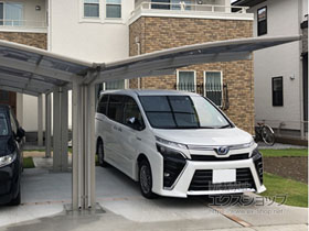 アリュース 600タイプ 縦連棟セット(4台用)とプレシオスポート アール型の施工をご依頼頂きまして、誠に有り難うございます。無駄のないすっきりしたデザインですので、屋根の下も広々とご使用頂けるものと存じます。熱線遮断ポリカーボネートの屋根材は、雨だけでなく、有害な紫外線や熱も遮断するため、1年を通して快適にご使用頂けるものと存じます。特に、お車4台分のスペースは広々として、様々な用途にご活用頂けますね。これからも、エクステリアの施工を通じて、豊かな暮らしのお手伝いをして参ります。また機会がございましたら、是非エクスショップにご用命頂きますよう宜しくお願い致します。