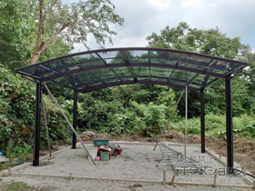 プレシオスポート アール型 2台用の施工をご依頼頂きまして、誠に有り難うございます。アーチ状の屋根が、お車を優しく包み込むようなお仕上がりですね。熱線遮断ポリカーボネート(スカイブルー・マット調)の遮熱性、遮光性にご満足頂いておりますこと、私どもも大変嬉しく存じます。雨天時の乗り降りの煩わしさも、軽減されるものと存じます。これからも、お客様のご期待を裏切らないよう精進して参ります。また機会がございましたら、是非エクスショップをご利用頂きますよう、宜しくお願い致します。