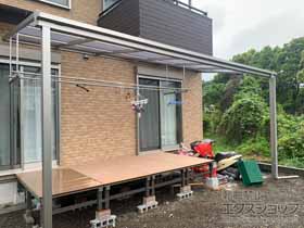 この度は弊社でヴェクターテラス F型 ビッグサイズとマージウッドデッキの施工のご依頼を頂きまして、誠に有り難うございます。木の風合いを感じるウッドデッキが、ご自宅のイメージに馴染み、温かみを感じるお仕上がりでございますね。お部屋から段差なくお庭へと続き、気軽にお洗濯物を干して頂けるものと存じます。ホワイトカラーのフレームが既存のサッシのお色にマッチしたテラス屋根は、ウッドデッキのテラスを覆うように完成し、自転車の雨よけやお荷物の仮置きなどにも便利でございますね。これからもお客様一人一人に合った施工の提案が出来るよう、スタッフ一同努力を重ねて参りますので、また機会がございましたら、是非エクスショップにご用命頂きますよう、宜しくお願い申し上げます。