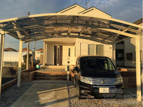 プラチナステンのフレームとポリカーボネート(トーメイマット)の屋根が、ご自宅の外観とマッチして、違和感のないお仕上がりでございますね。2台のお車をゆったり駐車することができ、お車の汚れや傷みを防ぐことができます。雨の日の乗り降りもスムーズになり、いつでもお車を快適にご使用頂けるものと存じます。今後も、エクステリアの施工を通してお客様に笑顔をお届け出来ますよう、日々精進して参ります。また機会がございましたら、是非エクスショップにご用命頂きますよう宜しくお願い致します。