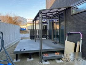 以前カーポートの工事を任せて頂き、この度もリウッドデッキ 200とソラリアF型 テラスタイプの施工のご依頼を頂きまして、誠に有り難うございます。お部屋からフラットに繋がるウッドデッキと、ウッドデッキを覆うように、ご自宅に寄り添うテラス屋根が完成し、温かみを感じるカラーが、お庭のイメージにマッチしておりますね。お部屋から段差がない事で、気軽にウッドデッキへと出て頂け、天候を気にせずにお洗濯物を干して頂けるものと存じます。2か所の掃き出し窓を繋ぐことで、家事効率もアップするのではないでしょうか。これからもお客様満足度100%を目指し、スタッフ一同日々精進して参りますので、今後もエクスショップをご愛顧頂きますよう、宜しくお願い申し上げます。