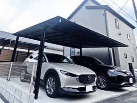 この度は、フーゴF (フラットスタイル) ワイドの施工をエクスショップにお任せ下さり、誠にありがとうございます。ブラックの柱が、ご自宅の外観ともマッチし素敵なお仕上がりとなりましたね。敷地をしっかりと覆う屋根が広がることで、雨天時の移動なども快適になった事と存じます。大切なお車を汚れや劣化から守りながら、駐車以外でも様々な用途で有効活用して頂けますので、この先長くご愛用頂けますと幸いです。エクスショップでは、暮らしを豊かにするエクステリア商品を多数取り揃えておりますので、また機会がございましたら是非弊社にご用命下さいませ。心よりお待ち致しております。