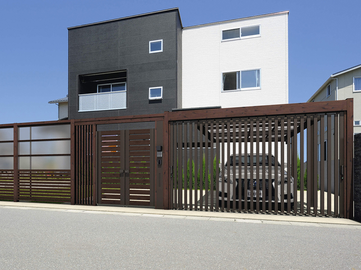 設置スペースの無駄を省いたダブルオープンタイプの車庫前ゲート。左右どちらからでも開き、開口を有効活用!ナチュラルテイストの木調デザインに加え、フレームと扉の色をアルミ形材色と木調色で組合せ可能。2014年グッドデザイン賞受賞カーゲートです。