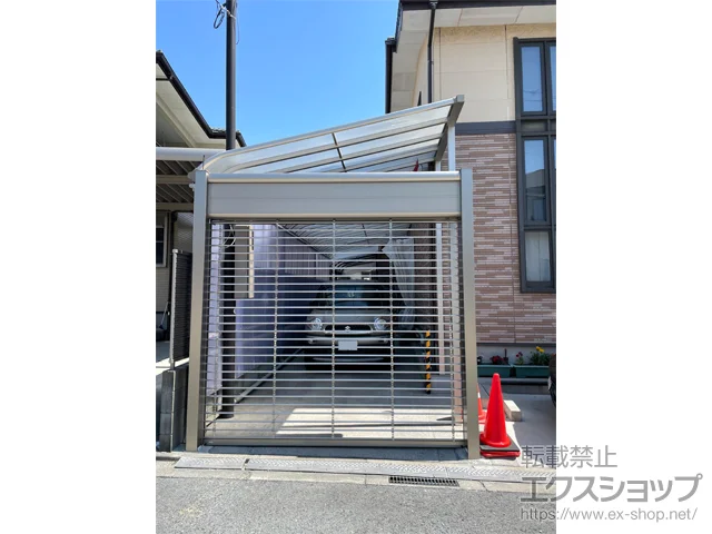 シャッターゲート FX1型 電動式はエクスショップオリジナルブランドのシースルー仕様のガレージシャッターで、敷地に合わせたサイズのオーダーが可能です。(開口幅2,000〜2,800mm、開口高さ2,100〜2,500mmの間)