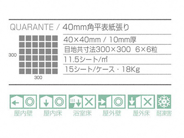 【大きさ】40mm×40mm×10mm【仕上げ】平表紙張り【目安量】11.5枚/u目地残り・のり残りに注意してください。目地は10mmに設定してあります。ミックスによる色幅と土物特有の大きな色幅がある製品です。*印は割増価格となります。また、注文を受けてからの加工となりますので納期をご確認ください。