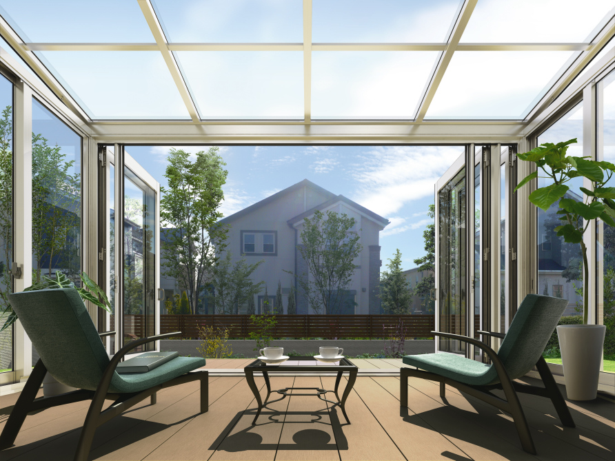 暮らしの変化に合せて、自由にお使いいただけるテラス囲いです。屋根材・屋根形状・カラーを選んでいただけるので、建物のデザインにも合わせやすくなっております。洗濯物干し・ガーデニングスペース・さらなるリビング空間と多種多様に使用でき、暮らしに彩りを添えてくれるもう一つの快晴空間です。積雪対応〜100cm対応タイプです。