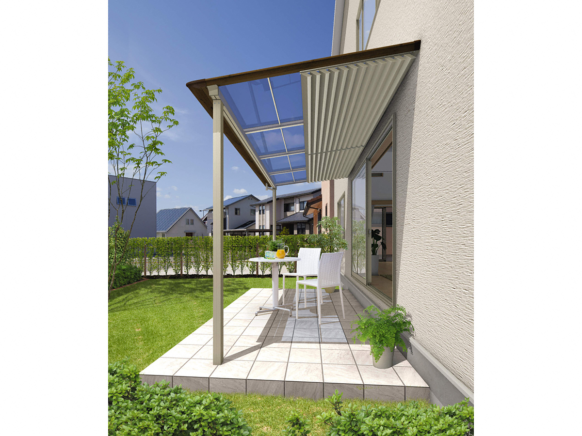 屋根枠と桁が曲面デザインで統一された統一感のあるフォルム。トレンド住宅に似合うモダンなデザイン。木目調のラインナップも取り揃え、たたずまいが美しいモダンテラスが登場しました。