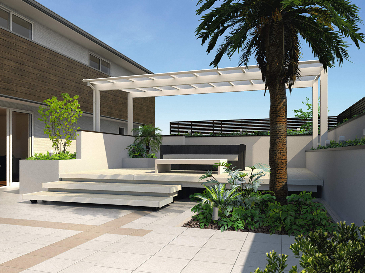 サイズバリエーションが豊富で、屋根材の種類も全6種類ご用意しています。従来よりも屋根の桟を減らした構造にすることで、上を見上げた際もスッキリと広く感じます。