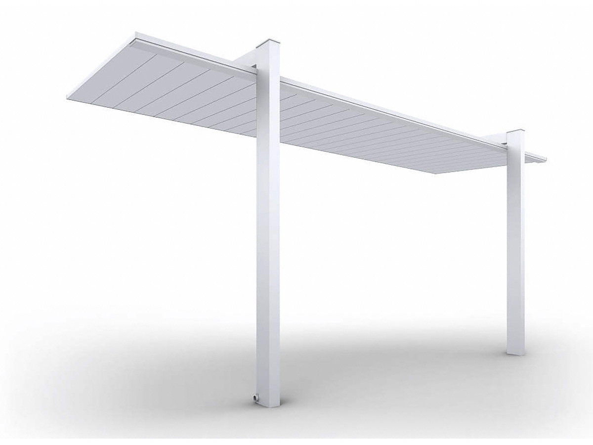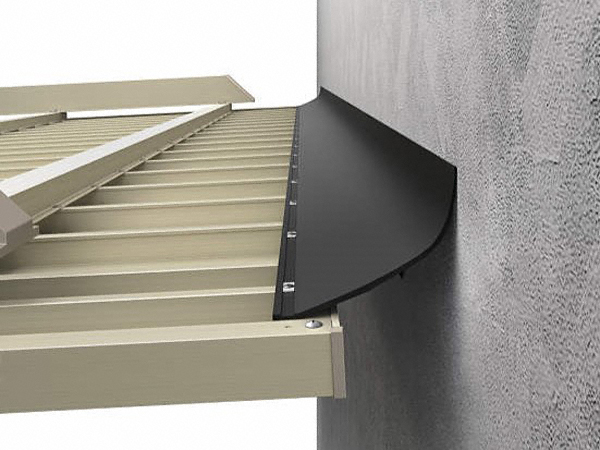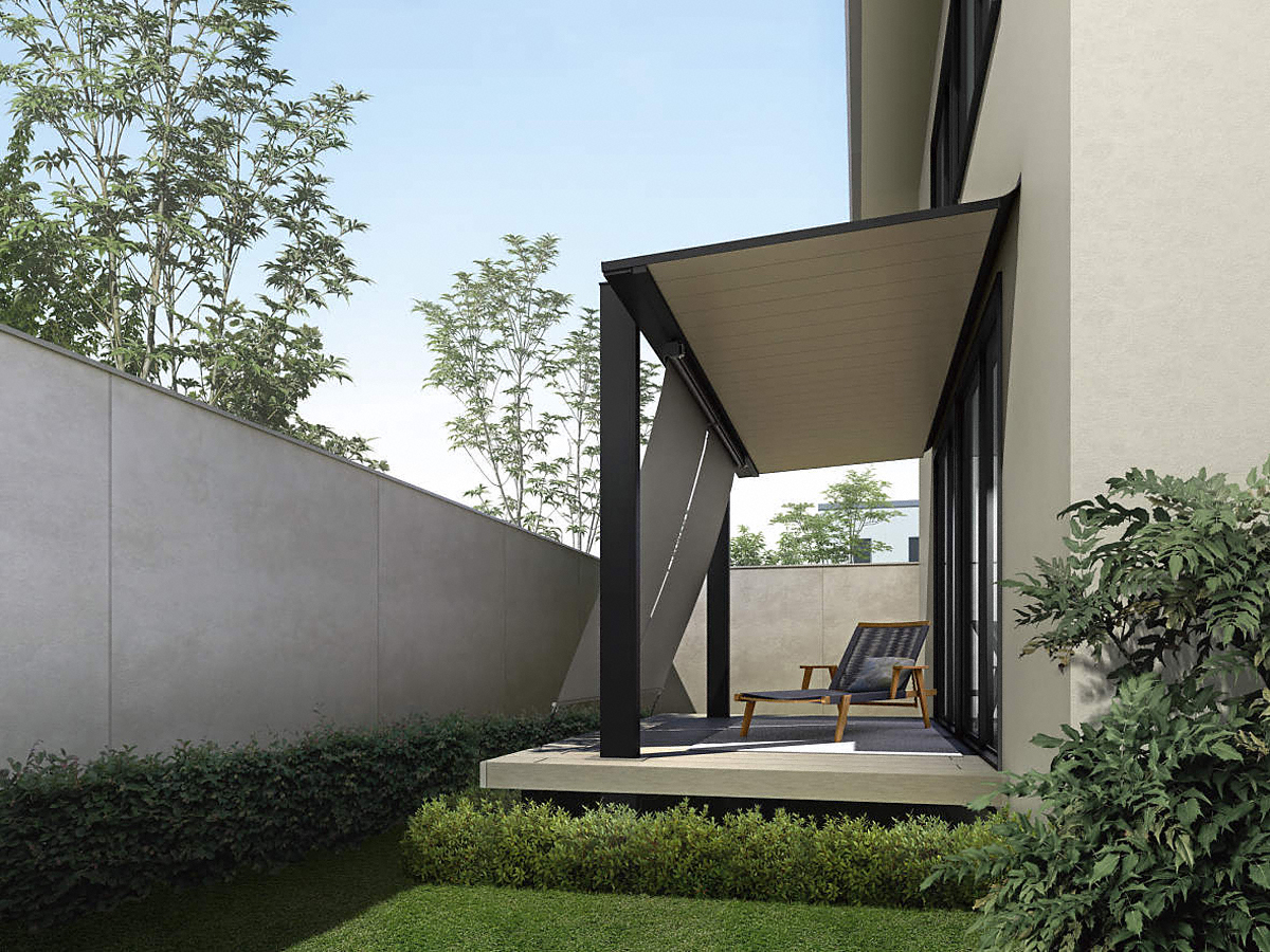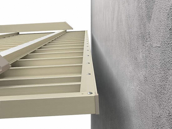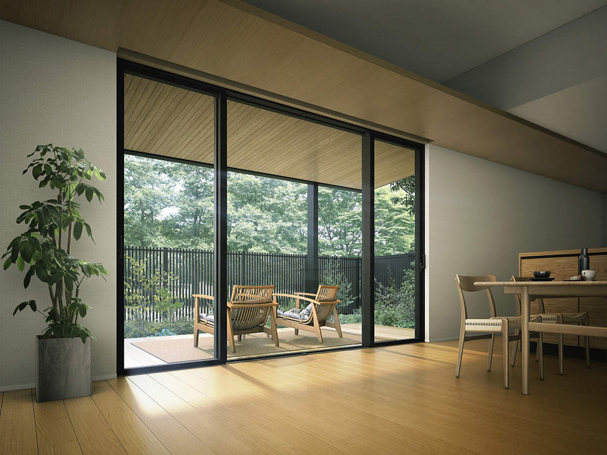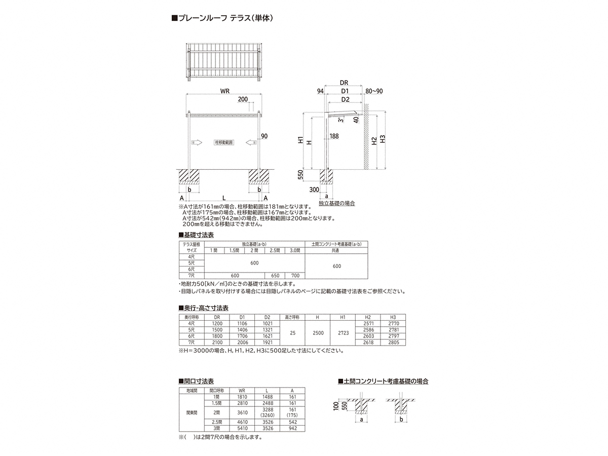 プレーンルーフ テラスは外壁に依存せず独立して設置できるテラス屋根です。屋根は勾配3゜・厚さわずか40mmのノイズレス仕様。また、アルミ材質なので高い遮熱性があり、屋根上の汚れも見えにくいです。性能面は基準風速Vo=38m/s・耐積雪性能20cm相当があります。