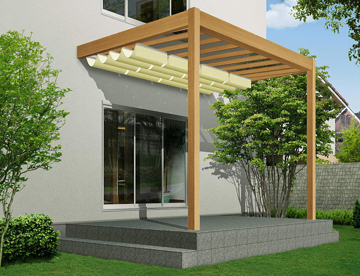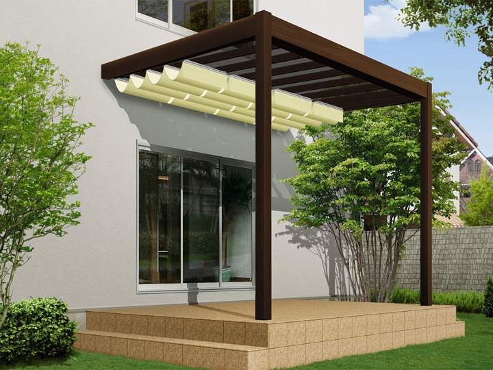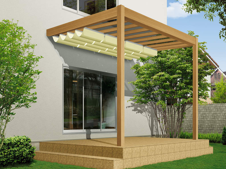 建物とエクステリア空間をトータルコーディネートする「リレーリア」シリーズのテラス屋根です。洗練されたデザインで上質なテラス空間を演出します。日差しを調節できるサンシェードカーテンをセットしています。上品な木調色マテリアルカラーをご用意しました。