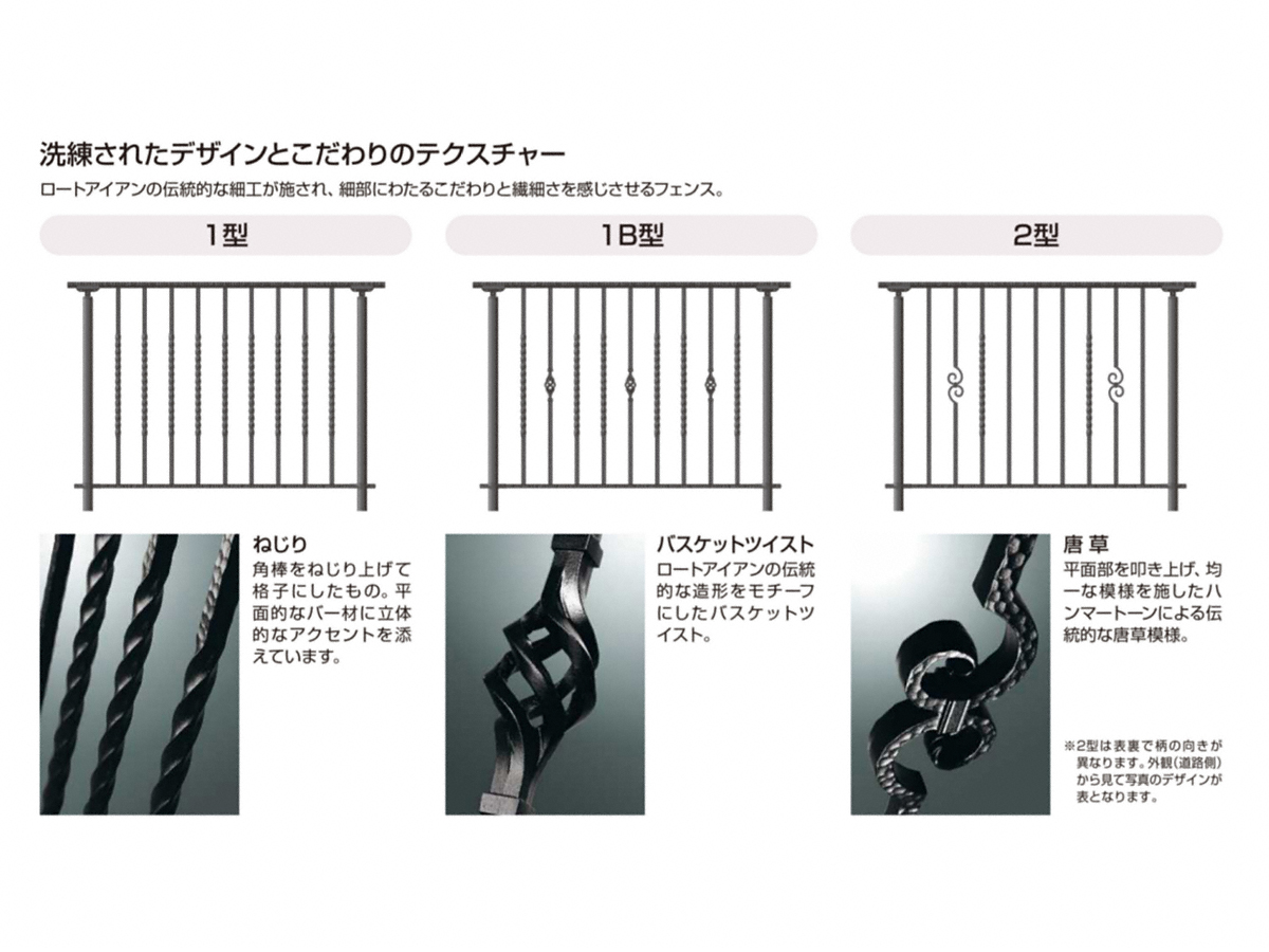シャローネ 歩行補助手すり1B型はアルミ鋳物製の手すりです。柱・部品は繊細な凹凸感があるサンドブラスト調仕上げとなっています。また、カラーは上質感があり外観を引き締めるカームブラック色。1型はねじり/2型はバスケットツイスト/3型は唐草模様の格子デザインです。