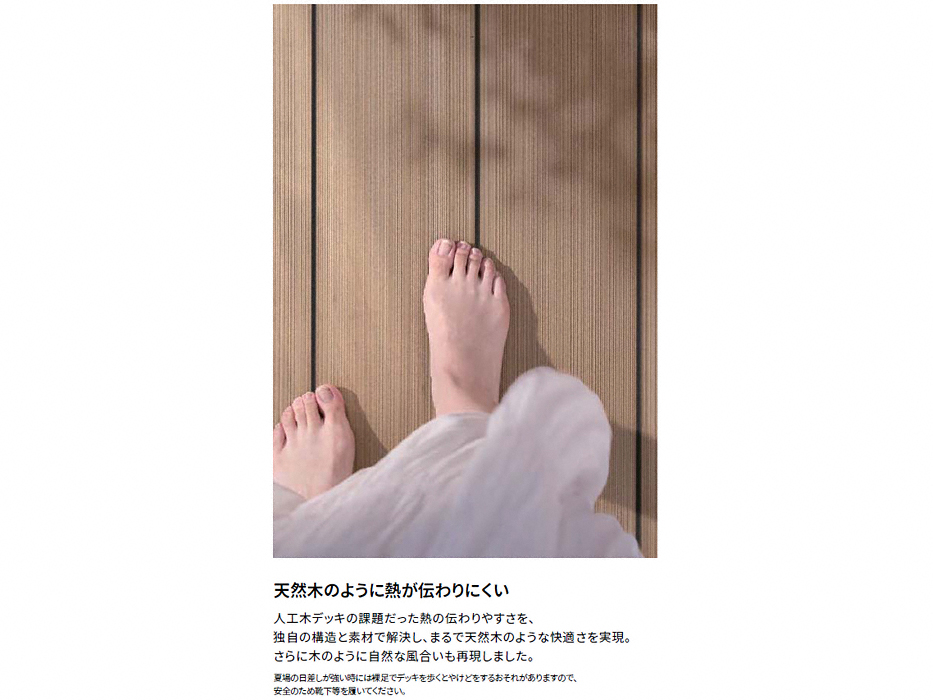 デッキDCは低い熱伝導率の樹脂材+蓄熱を抑える独立気泡構造を採用した人工木デッキです。熱さを感じにくいデッキDCは乗った後の足裏温度が、一般的な人工木デッキと比べて約4℃低くなります(LIXIL社独自試験)。従来品より約1/3の熱伝導&約2/3のデッキ重量を実現しました。