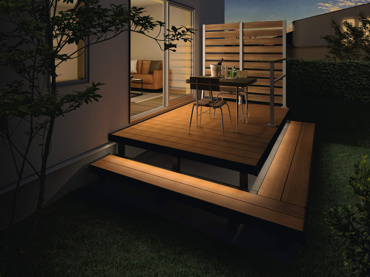 人工木デッキ ヴィラウッド アルミ幕板仕様 スタンダードタイプは幕板部分がアルミのため、洗練された締まりのあるデッキ空間になります。エクスショップはまるで別荘〈ヴィラ〉に佇むような特別な時間を感じられる人工木デッキ ヴィラウッド アルミ幕板仕様 スタンダードタイプをおすすめします。