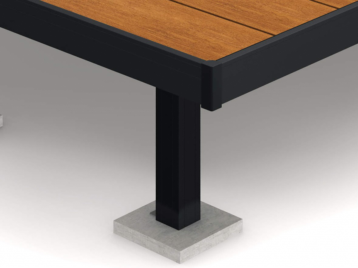 人工木デッキ ヴィラウッド アルミ幕板仕様 スタンダードタイプは熱伸びの影響を抑えるブラックカラーのアルミ幕板を用いたウッドデッキです。床下の束柱・大引きはアルミ形材なので、シロアリや害虫などによる被害を抑えられます。また、床板の人工木表層材に昇温抑制効果のある遮熱顔料を採用しています。鉛直荷重強度は1800N/uです。