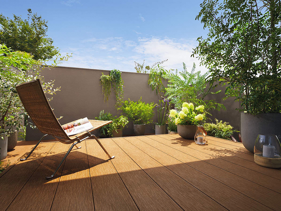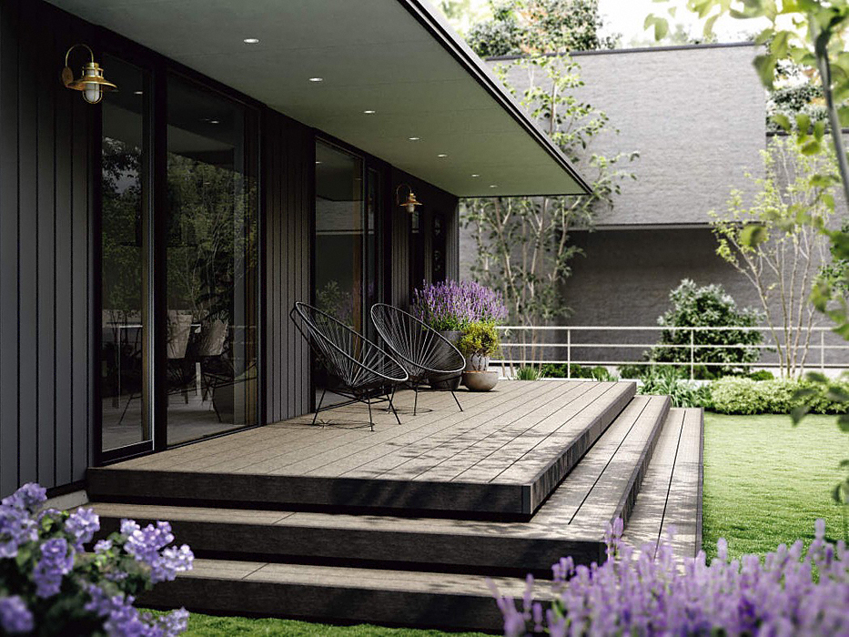 耐久性抜群の人工木ウッドデッキ。メンテナンス簡単、環境に優しく、天然木のような質感ながらが高耐久性が魅力のウッドデッキ素材です。