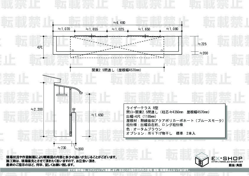 サイズ | 柱芯々 4,350mm 屋根幅 4,570mm 出幅 1,185mm |
