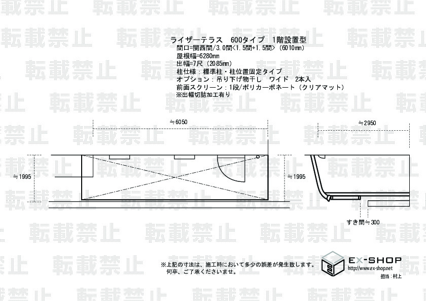 サイズ | 間口 6,010mm 屋根幅 6,280mm 出幅 2,085mm |