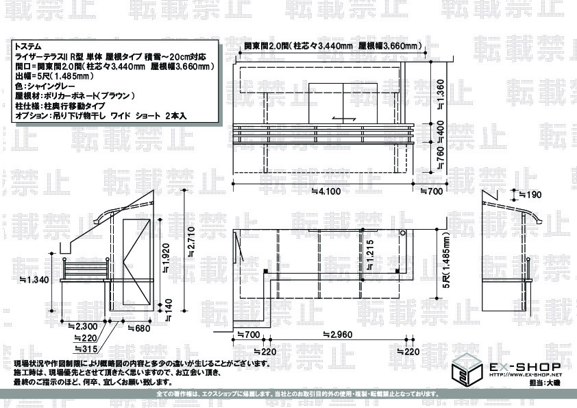| サイズ | 柱芯々 3,440mm 屋根幅 3,660mm 出幅 1,485mm |