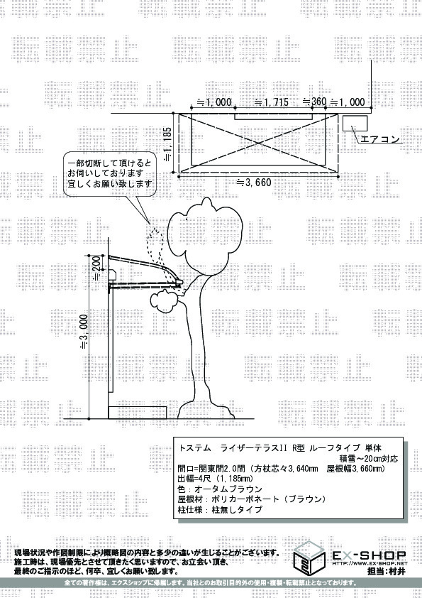 サイズ | 方杖芯々 3,640mm 屋根幅 3,660mm 出幅 1,185mm |