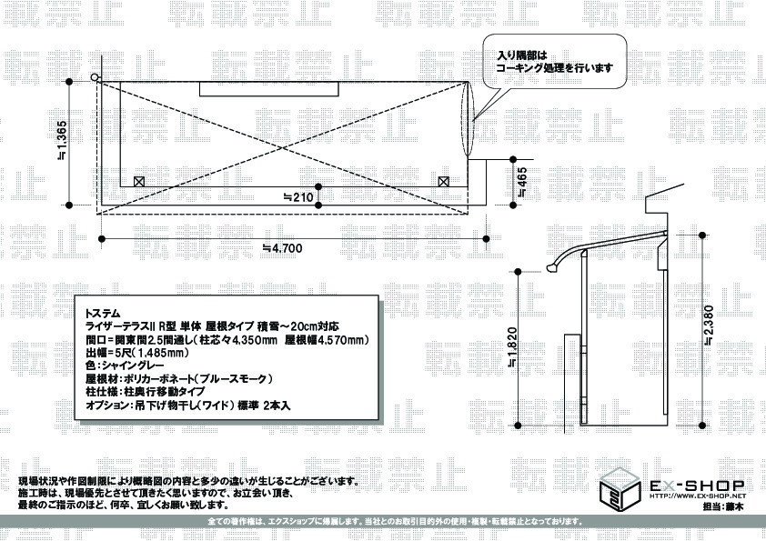 サイズ | 柱芯々 4,350mm 屋根幅 4,570mm 出幅 1,485mm |