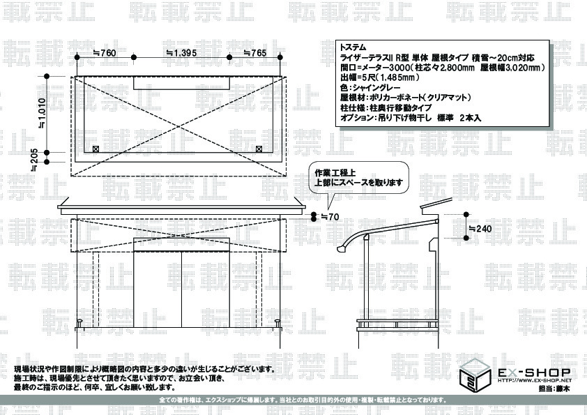 サイズ | 柱芯々 2,800mm 屋根幅 3,020mm 出幅 1,485mm |