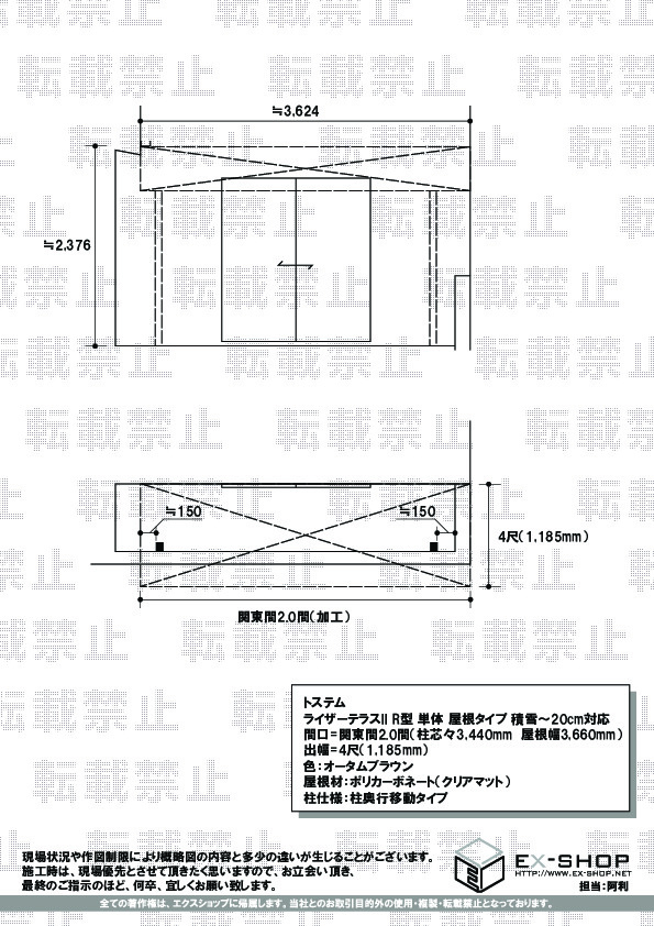 | サイズ | 柱芯々 3,440mm 屋根幅 3,660mm 出幅 1,185mm |