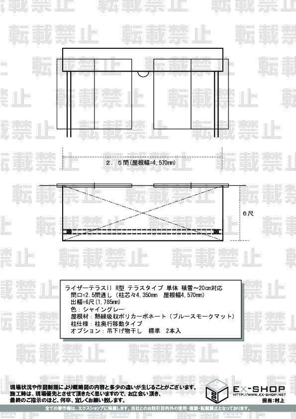 サイズ | 柱芯々 4,350mm 屋根幅 4,570mm 出幅 1,785mm |
