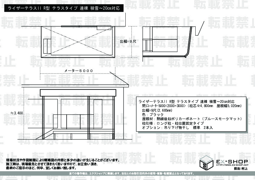サイズ | 柱芯々 4,800mm 屋根幅 5,020mm 出幅 2,685mm |