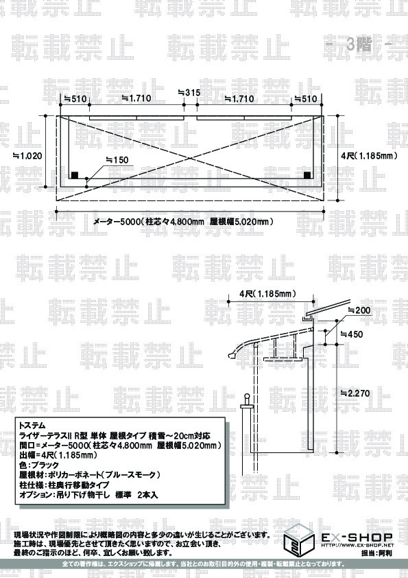 | サイズ | 柱芯々 4,800mm 屋根幅 5,020mm 出幅 1,185mm |