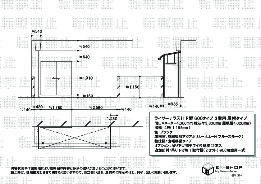 サイズ | 柱芯々 3,800mm 屋根幅 4,020mm 出幅 1,185mm |