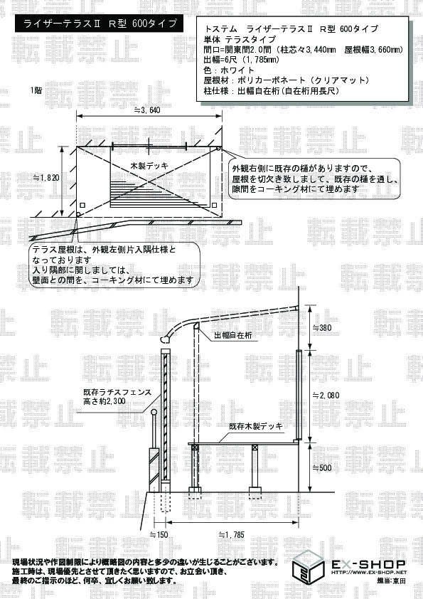 | サイズ | 柱芯々 3,440mm 屋根幅 3,660mm 出幅 1,785mm |