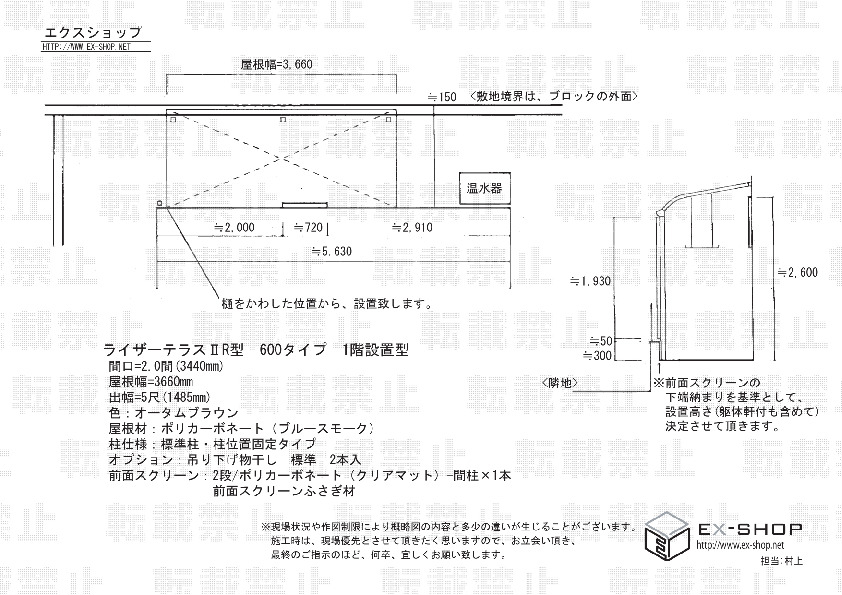 サイズ | 間口 3,440mm 屋根幅 3,660mm 出幅 1,485mm |