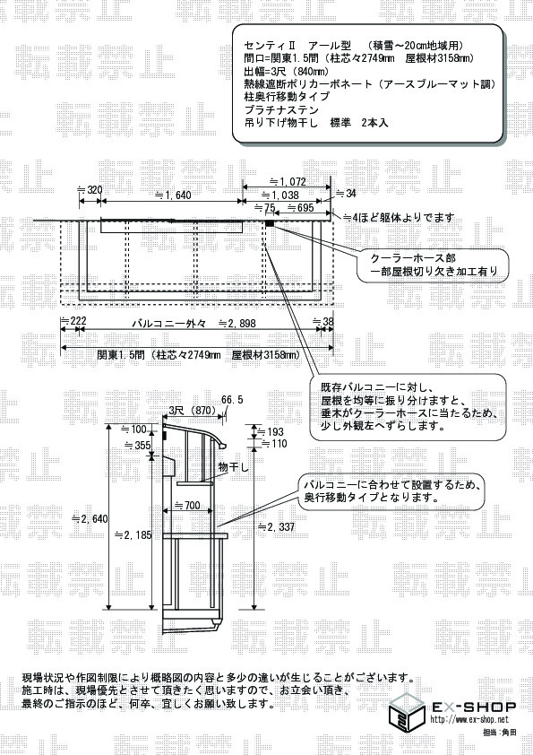 | サイズ | 柱芯々 2,749mm 屋根幅 3,158mm 出幅 840mm |
