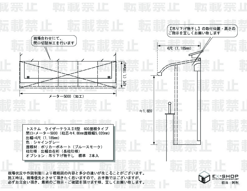 | サイズ | 柱芯々 5,000mm 屋根幅 5,020mm 出幅 1,185mm |