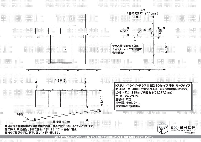 サイズ | 間口 4,000mm 屋根幅 4,020mm 出幅 1,185mm |