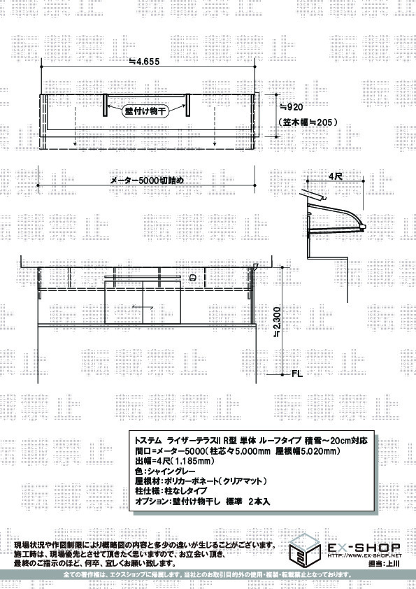 サイズ | 柱芯々 5,000mm 屋根幅 5,020mm 出幅 1,185mm |