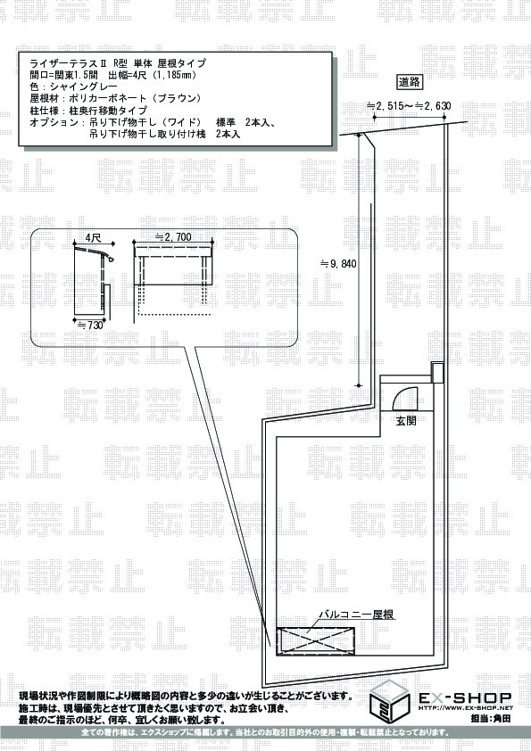 サイズ | 柱芯々 2,530mm 屋根幅 2,750mm 出幅 1,185mm |